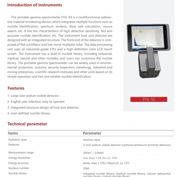 The portable gamma spectrometer FYJL-50 is a multifunctional radioactive material monitoring device, which integrates multiple functions such as nuclide identification, spectrum analysis, dose rate calculation, source search, etc. It has the characteristics of high detection sensitivity, fast and accurate nuclide identification, etc. The instrument host and detector are designed with an integrated structure. The front end of the detector is composed of Nal scintillator and low-noise multiplier tube. The data processing unit uses an industrial-grade CPU and a 5-inch high-definition color LCD touch screen. The instrument has a built-in nuclide library, including industrial, medical, natural and other nuclides, and users can customize the nuclide library. The portable gamma spectrometer can be widely used in environmental protection, customs, security inspection, metallurgy, industrial and mining enterprises, scientific research institutes and other units based on its simple operation and fast and reliable nuclide identification.